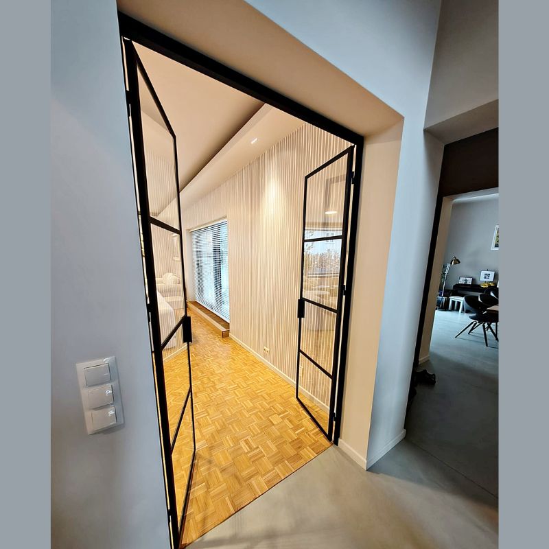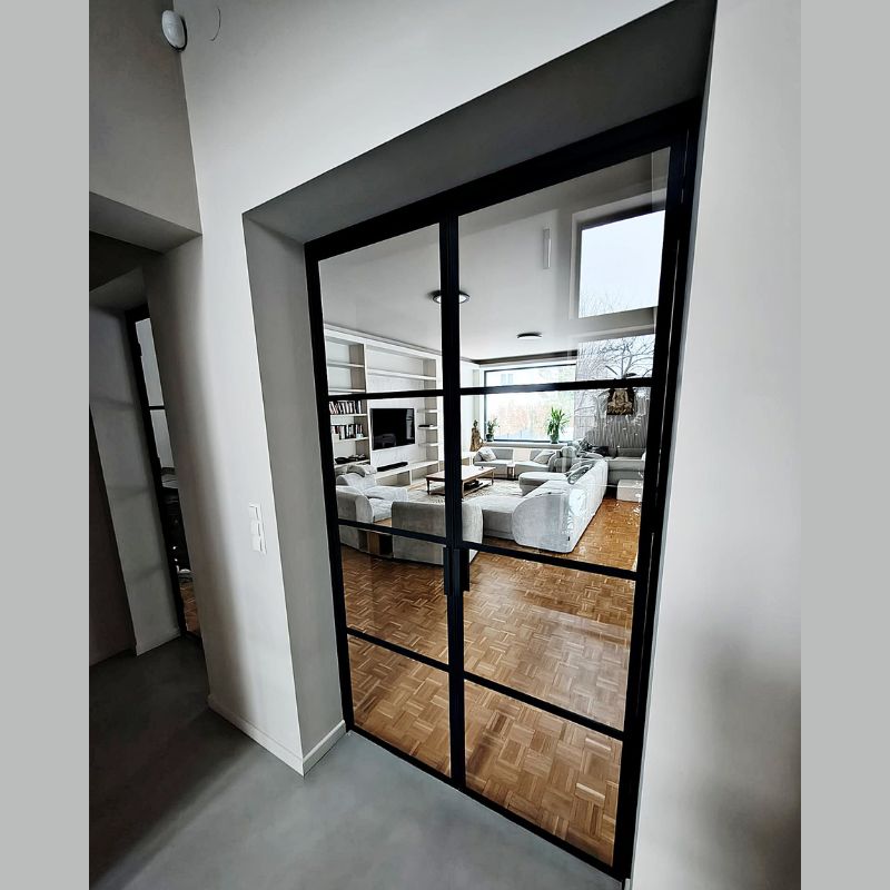 Drzwi podwójne stalowe w stylistyce loftowej stanowią połączenie nowoczesnego designu z wysoką funkcjonalnością. Konstrukcja wykonana z precyzyjnie spawanych profili stalowych zapewnia trwałość, stabilność oraz odporność na intensywne użytkowanie. Zastosowanie przeszkleń umożliwia optyczne otwarcie przestrzeni i swobodny przepływ światła, przy jednoczesnym zachowaniu wyraźnego podziału stref. Drzwi doskonale wpisują się w aranżacje industrialne, minimalistyczne oraz nowoczesne wnętrza mieszkalne i komercyjne. Każda realizacja przygotowywana jest na wymiar, z uwzględnieniem indywidualnych potrzeb inwestora oraz parametrów technicznych otworu drzwiowego.